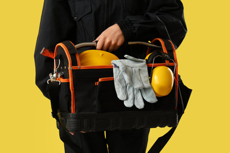 Worker with tool bag and hardhat on yellow background