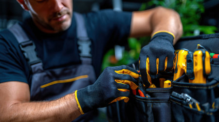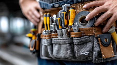 Close up of a Handyman Wearing Plaid Shirt with Tool Belt Filled with Work Tools AI Generative