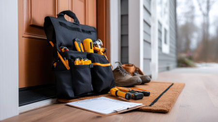 A tool bag is on the front door of a house. The bag contains a variety of tools, including a hammer, screwdriver, and pliers. The bag is placed on a wooden floor next to a clipboard
