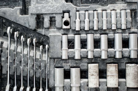 Mechanic essential instruments. Closeup of chrome wrench tools organized in box.