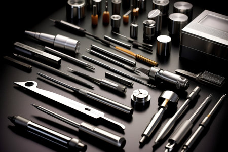 A captivating close-up image showcasing a selection of metal drill bits and tools arranged on a dark surface, highlighting unique textures and craftsmanship.