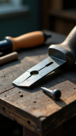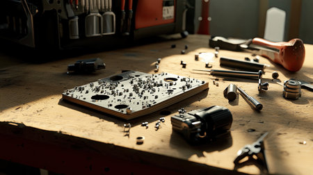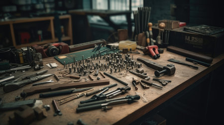 An intricate arrangement of tools and metal parts on a wooden workbench captures the essence of craftsmanship in a well-lit workshop environment.