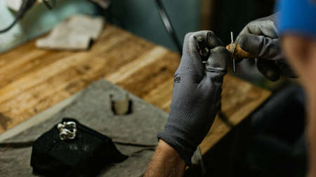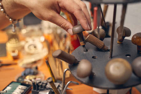 Cropped photo of a young professional jeweler grasping an engraving tool with a wooden handle