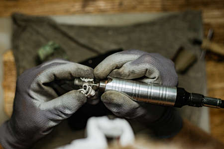 close-up. The jeweler makes a silver ring