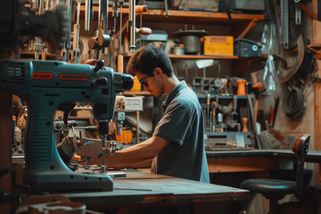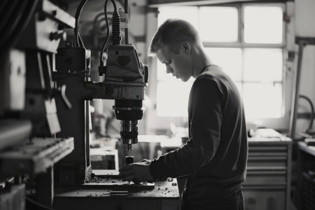young man standing at drilling machine and repairing in factory