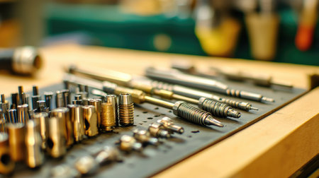 An intricate arrangement of various precision metal tools on a workbench, showcasing craftsmanship and attention to detail in a workshop environment.