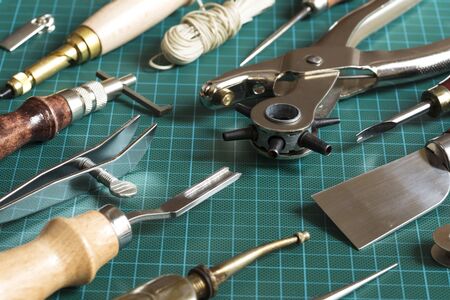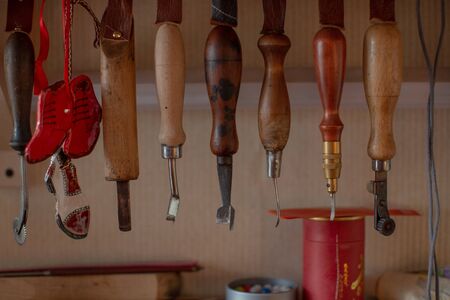 The workplace of a master shoemaker and his tools closeup