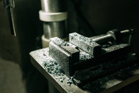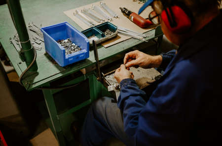 A worker in overalls works behind a workbench with metal vises. Production of metal parts at the factory. Equipment assembly.