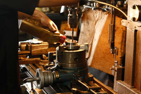 An old but still working lathe. Industrial background.