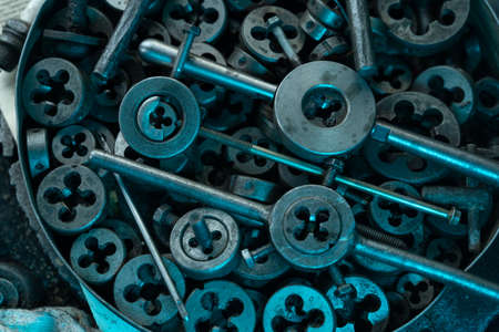 old rusty locksmith dies and taps for tapping. Lie box top view.