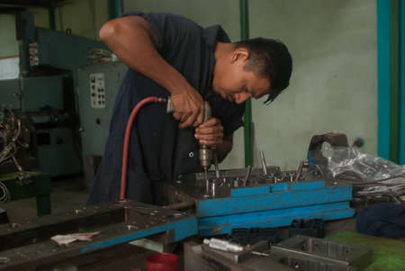 Metal engine parts being drilled, bored and lathed in a metal engineering workshop in Thailand, Southeast Asia