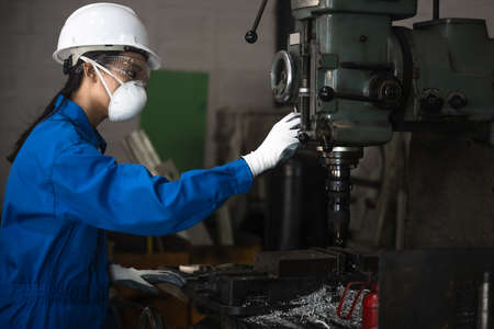 Woman engineering technician working on machinery drilling metal with with job in working carefully handle