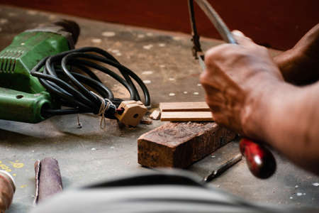 A mechanic does carpenter jobs with wood, plus and other tools. He is hitting hammer on the head of nail to wooden pieces and cutting wooden sticks by saw. A drill machine is kept on floor beside him.