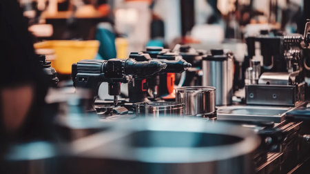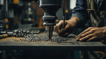 Close up of a metalworker operating a lathe machine, shaping metal components with precision and expertise in a bustling workshop environment