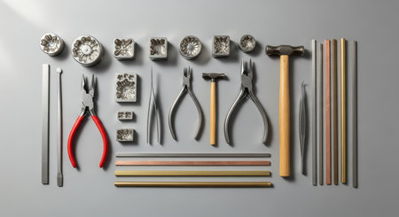 Jewelry crafting tools: hammer, pliers, stamps, and metal rods