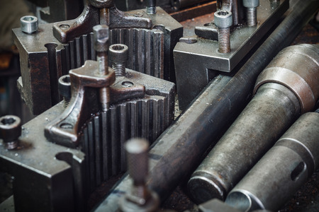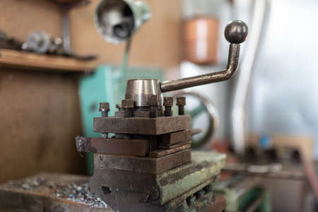 Old lathe for metal processing. Type of metal machine parts in lathe shop at factory. Industrial background. Industrial equipment..