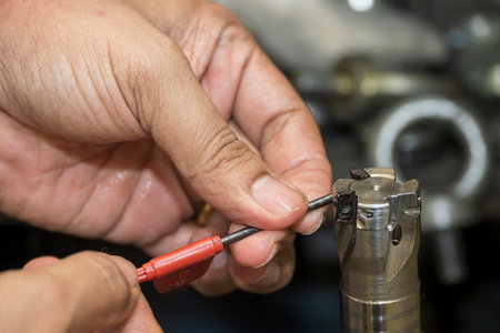 Man’s hand with milling machine tool holder in a smith workshop. Close up.
