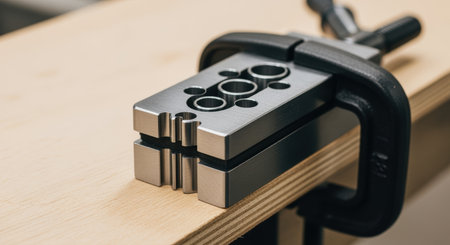 Precision metal drill guide clamped to wooden board for accurate woodworking and carpentry hole alignment in workshop setting.