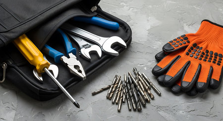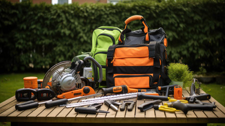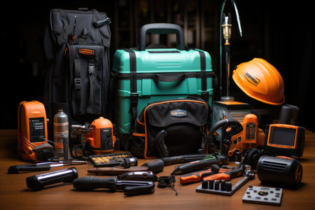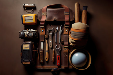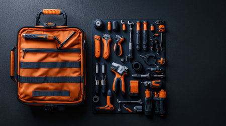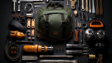 An AI generated illustration of An assortment of tools are displayed on a dark table top in a top-view angle