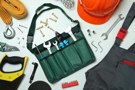 Bag for construction tools, hard hat and trowel on textured table against light background