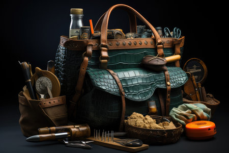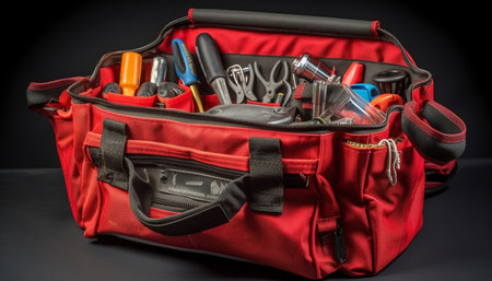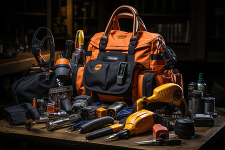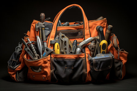 An AI generated illustration of a bag with a selection of tools on a dark background