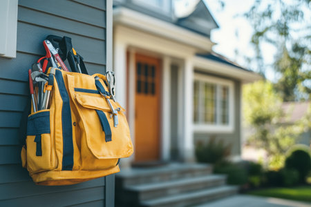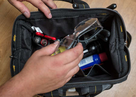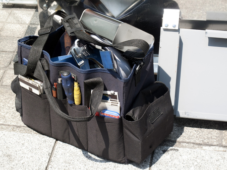 Contractors Tools Bag Closeup Photo. Construction Site Object.