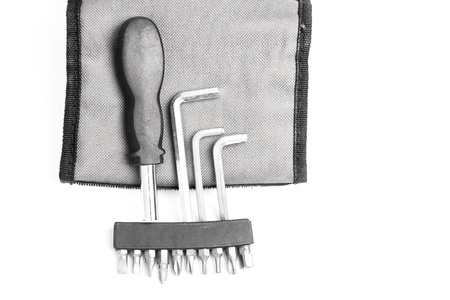 set of tools in a bag on wooden background, Close up of tools on a tool