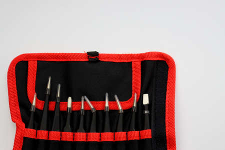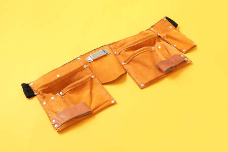 Set of tools in suede bag on yellow background prepared by the master electrician before repair or construction