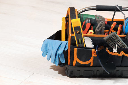 Bag with different tools for repair on light wooden table, space for text. Banner design