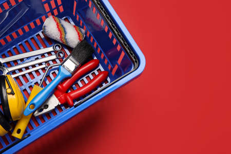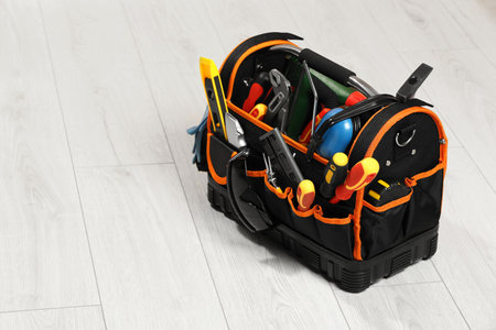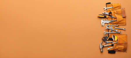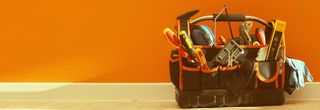Bag with different tools for repair on floor near orange wall, space for text. Banner design