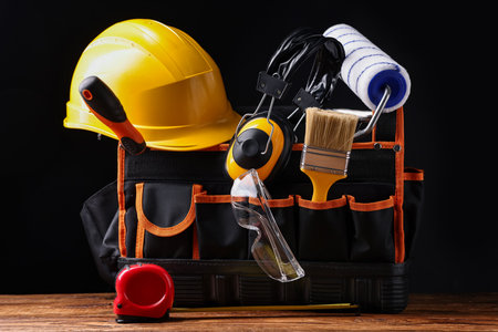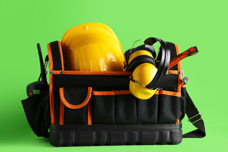 Tool bag with hardhat, protective earmuffs and radio transceiver on green background