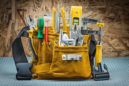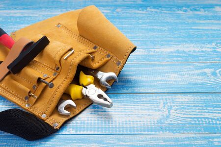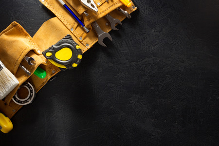 Top view of tool belt bag and old instruments constructor or renovation for build and repair house on rustic grunge wooden background
