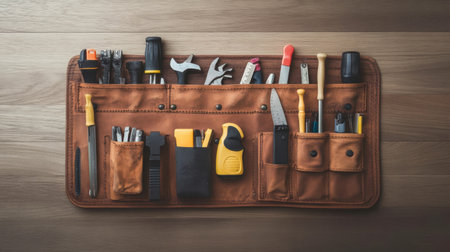 Toolbelt filled with everyday essentials laid flat on wooden surface