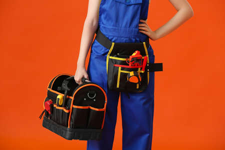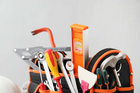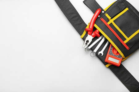 Close up of a maintenance worker with bag and tools kit wearing on waist.