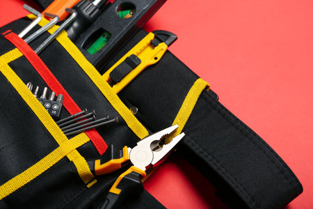 Labor Day. Hand tools lie in the masters belt bag, close-up. labor and employment concept.