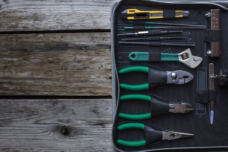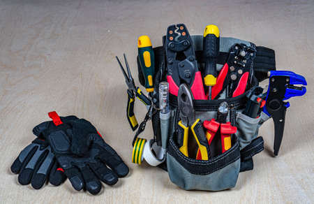 Electrician's bag with a professional electric tools. Pliers, wire cutters, strippers, screwdrivers, testers, crimping pliers. Plywood background. Place photo text.