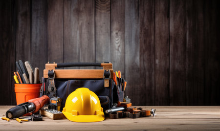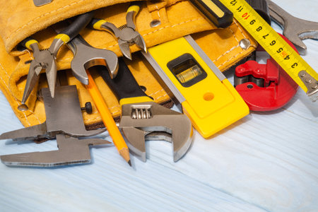 tools and instruments in belt on wooden table in front, plank board background texture surface