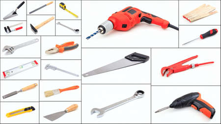 Set of hand tools on white background collage