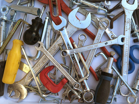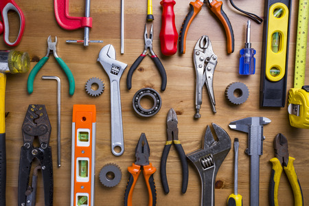 Various hand tools for build and repairing on working table.