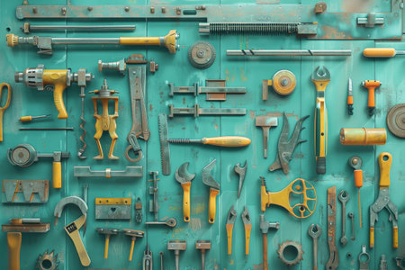 Top view of monochrome construction tools for repair on blue and yellow