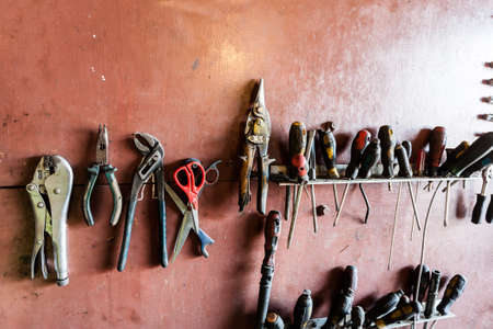 Workshop scene. Tools hanging on the wall in the workshop, garage vintage style