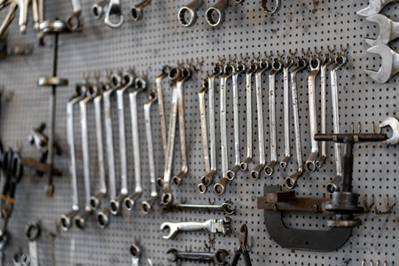 Repairman's workshop, close-up low-key image. Well organised workplace of a mechanic, rows of spanners and other tools