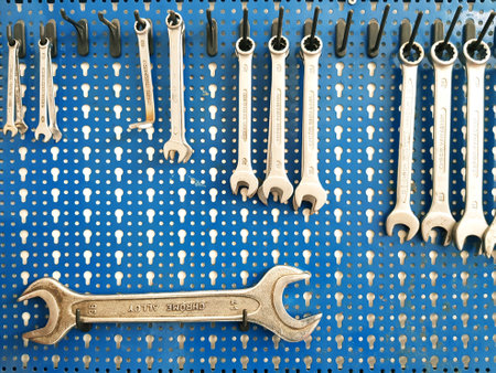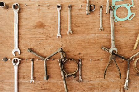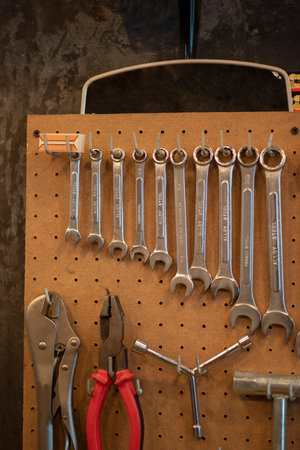 Collection of spanners wrench tools tidy on board in garage , process in vintage style