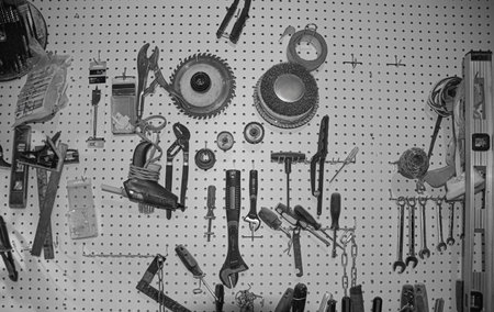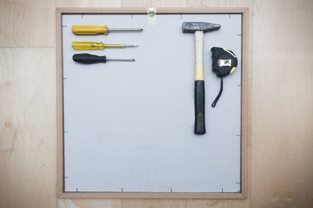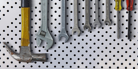 Tools hanging on a wooden clipboard, hobby time in garage.