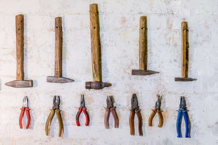 Old wooden hammers and pliers hanging on a wall in workshop.