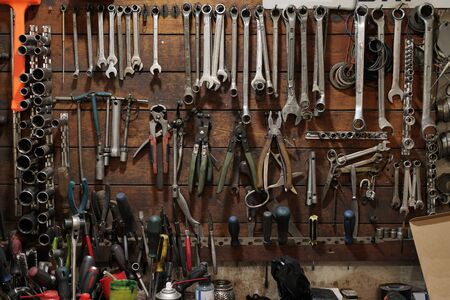 Many tools for repairing motorcycles hanging on wall in workshop. Set Craftsman tool , mechanical tools. Professional mechanic using different tools for working in motorbike repair service at garage.
