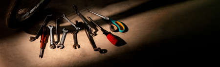 Professional Chrome tools work of a mechanic in a workshop on a blue metal workbench. Handicraft workshop, repair and maintenance of bicycles, motorcycles and cars. Soft focus and beautiful bokeh.