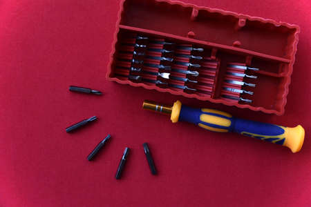 A set of various screwdrivers bits with different attachments in a plastic orange box in a master hand. Different screwdrivers for repair work. Set of tools for small repairs. Screw driver tip set.