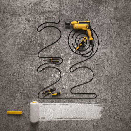 Top view of monochrome construction tools for repair and installation on grey and yellow background. 3d rendering and illustration of service banner for house plumber or repairman