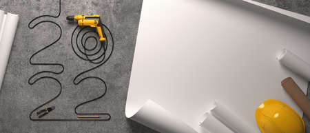 Contractor theme. Tool kit of the contractor: yellow hardhat, libella, hand saw. Plans and notebook on the gray tiles background.